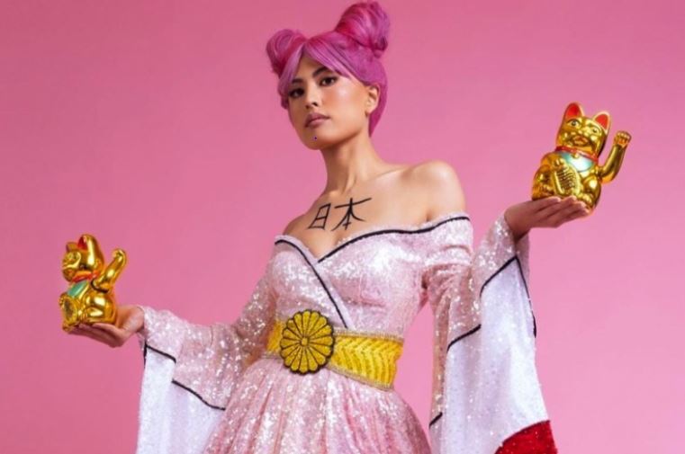 경단처럼 동그랗게 말아올린 분홍머리, 앞섶이 크게 벌어진 기모노풍 연분홍 드레스, 소매에 길게 늘어진 일장기, 가슴에 새긴 한자 '日本'(일본), 양손에 든 황금색 마네키네코(한쪽 앞발을 든 고양이 인형)…….