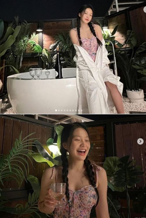이날 예리는 야외 욕조가 딸린 한 펜션에서 핑크빛 원피스 수영복을 입고 샴페인 잔을 들고 있다.