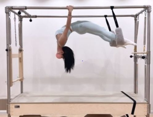 하늘색 레깅스를 입은 클라라는 완벽한 몸매를 뽐내며 기구에 매달려 엄청난 유연성을 자랑하며 운동에 집중하고 있다.
