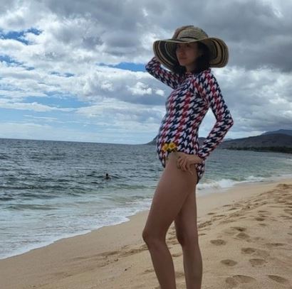 전혜빈은 흐린 날씨의 바다를 배경으로 상체를 덮는 점프수트 스타일의 수영복을 입고 포즈를 취했다 . 2세를 임신 중인 그의 살짝 드러난 D라인이 눈길을 끈다.