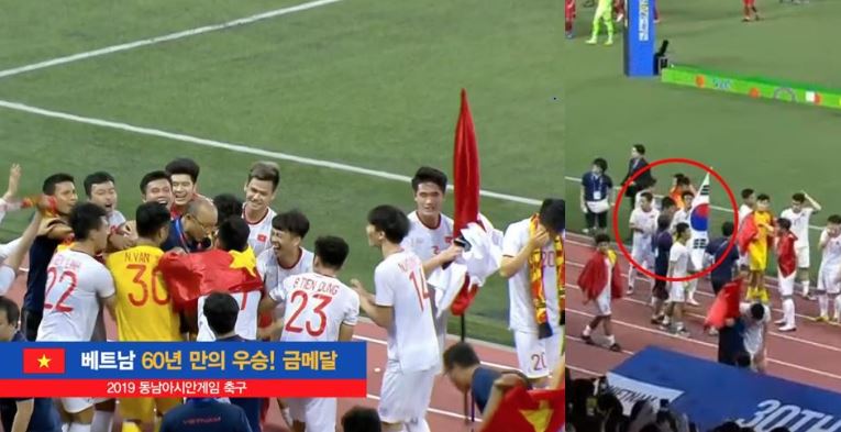 베트남 선수들은 우승을 확정 짓자 경기장에서 '금성홍기와 한장으로 이어붙인 태극기'를 휘날리며 기쁨을 만끽했다.