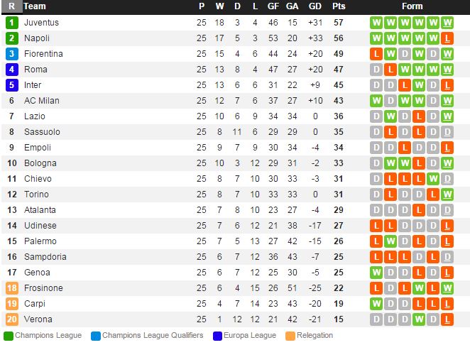 베로나는 지난 라운드 라치오 원정 경기에서 2-5 대패를 당하며 최근 이어오던 무패행진이 마감되었다. 베로나는 여전히 강등권 탈출이 힘들어 보이지만 최근 공격력이 살아나고 있기에 수비력 안정만 된다면 좀 더 나은 결과를 얻을 수 있을 것이다. 키에보는 지난 라운드 사수올로전에서 1-1 무승부를 거두면서 리그 11위를 유지하고 있다. 팔로스키의 공백을 비르사가 최근 활약하며 메꿔주고 있는 모습이다.
