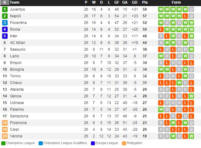 유벤투스는 지난 라운드 볼로냐 전에서 무기력한 경기력을 보이며 0-0 무승부를 거두고 기나긴 연승 행진이 마감 되었다. 거기에 주중 뮌헨 과의 챔스 경기까지 치러야 하는 빡빡한 일정 속에 있다. 산드로-만주키치 등 몇몇 선수들이 부상에 시달리고 있는 점도 흠이다. 인테르는 지난 라운드 삼프도리아 전에서 3-1 승리를 거두고 리그 5위를 유지하고 있다. 이카르디가 최근 경기에서 득점포를 가동하면서 컨디션을 끌어올리고 있지만 최근 맞대결에서는 3무 3패로 단 1번도 승리를 거두지 못했다.