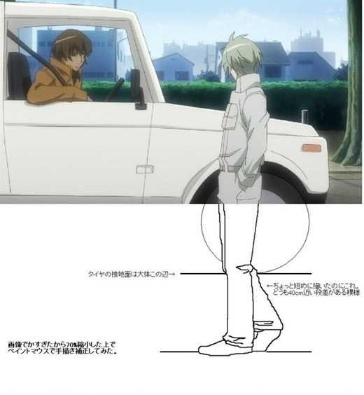 이 장면을 문제 삼은 최초의 주장은 자동차 바퀴의 크기를 고려해봐도 등장인물이 2등신도 안된다는 대목이었습니다.