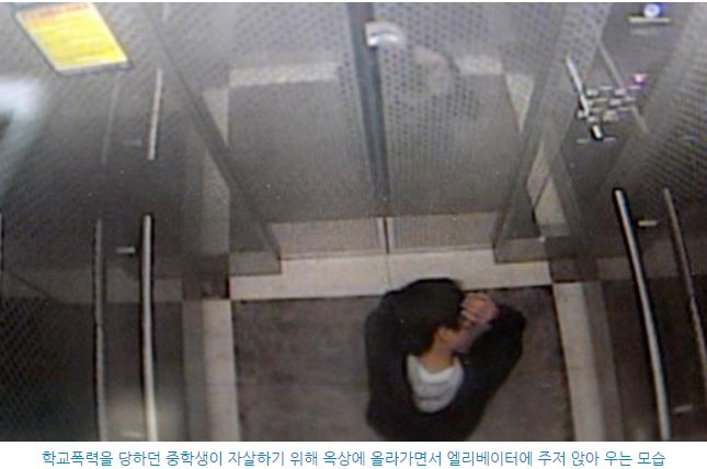 학교 폭력으로 인해 고통받던 중학생이 자살을 결심하고 엘리베이터를 타고 옥상에 올라갈 때 엘리베이터 내 CCTV에 찍힌 사진이다. 이 엘리베이터를 타고 옥상으로 간 중학생은 투신자살했고 결국 숨졌다.
