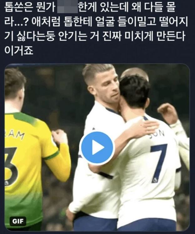 실존 인물인 축구선수 손흥민도 있습니다. 한 트위터 계정에는 손흥민과 그의 토트넘 팀 동료인 토비 알더베이럴트를 주인공으로 한 알페스 게시물이 올라왔는데요. 토비 알더베이럴트는 지난 2015년 결혼한 유부남입니다. 가도 너무 갔죠.
