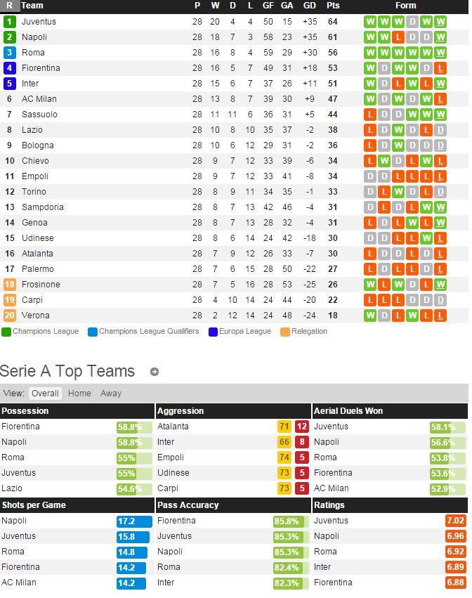 팔레르모는 지난 라운드 인테르 전에서 1-3 패배를 당하면서 최근 리그 7경기 연속 승리를 얻지못하고 있다. 최근 잦은 감독 교체를 통해서 경기력을 끌어올리려고 했지만 오히려 역효과가 나는 모습이고 선수들의 사기도 크게 떨어져 있는 모습이다. 나폴리는 지난 라운드 키에보 전에서 3-1 승리를 거두고 리그 2위를 유지하고 있다. 한동안 주춤하던 이과인의 득점포가 다시 가동 되고 있고 인시네-함식 등 2선 자원들의 활약도 역시 최근 좋은 모습이다.