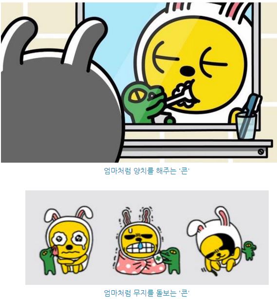 '콘이 무지를 키워냈다'는 것은 콘이 무지의 엄마 역할을 했다는 소리와 같다. 실제로 무지와 콘이 함께 등장하는 이모티콘을 살펴보면 엄마가 자식을 챙기듯 '콘'이 '무지'를 챙겨주는 이모티콘들이 많다.