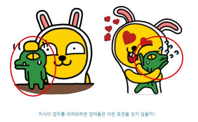 '콘'은 '무지'의 엄마라고도 할 수 있는데 자식이 자신보다 덩치가 커져서 자신을 귀여워하거나 들고다닌다면 엄마는 떨떠름한 표정을 짓게되지 않을까?