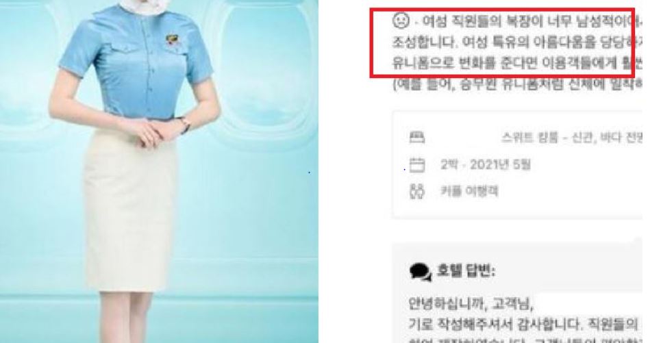 이에 호텔 측은 "직원들의 유니폼은 전문적인 서비스를 위해 고려하여 제작했다"며 "고객님들의 편안함과 즐거움을 선사해드리기 위해 노력하겠다"고 답했다.