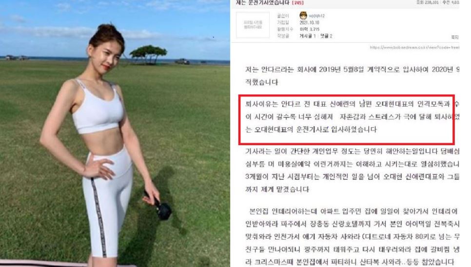 13일 업계에 따르면 이번 논란은 전 운전기사 A씨가 오대현 안다르 현 사내이사로부터 일명 '갑질'을 당해 퇴사를 결심했다는 글을 한 온라인 커뮤니티에 게재하며 촉발됐다. 오 이사는 신애련 안다르 창업자이자 공동대표의 남편으로 회사의 실질적인 운영을 함께하고 있다.