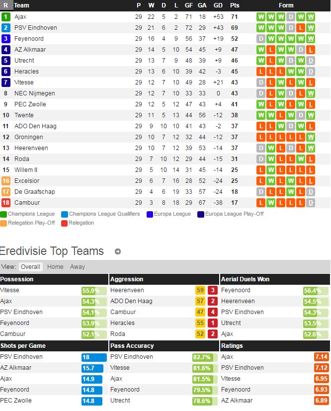 트벤테는 지난 라운드 빌럼 전에서 3-2 승리를 거두고 최근 리그 6경기에서 4승 1무 1패로 상승세를 유지하고 있다.  공격수 자이크는 팀을 최근 상승세로 이끌고 있으며 카브랄-쿠티에레즈 같은 선수들의 활약도 역시 좋다. 페예노르트는 지난 라운드 엑셀시오르 전에서 3-0 승리를 거두고 다시 리그 5연승을 거두고 있다. 최근 경기당 득점력이 2골이 넘을 정도로 카윗-크레머를 비롯한 공격진의 활약도가 대단히 좋으며 엘리아의 어시스트 능력도 돋보이고 있다.