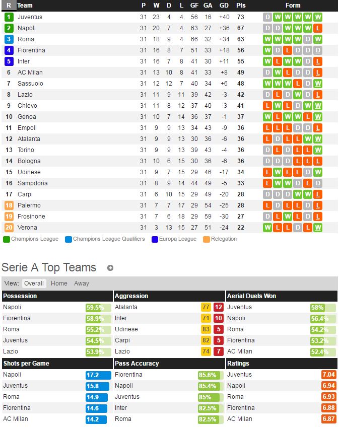나폴리는 지난 라운드 우디네세 전에서 1-3 패배를 당하면서 리그 1위와의 격차가 더욱 벌어졌다. 이과인은 지난 경기에서 득점에 성공하며 올시즌 리그에서만 30호골을 넣는 등 최고의 활약을 이어가고 있다. 베로나는 지난 라운드 볼로냐 전에서 1-0 승리를 거두며 실낱 같은 강등권 탈출의 희망을 이어갔다. 나폴리 원정에다가 객관적인 전력에서도 나폴리에 크게 뒤져 보이지만 토니의 한방에 희망을 걸어봐야 하지만 최근 부진한 경기력을 보여주고 있다.