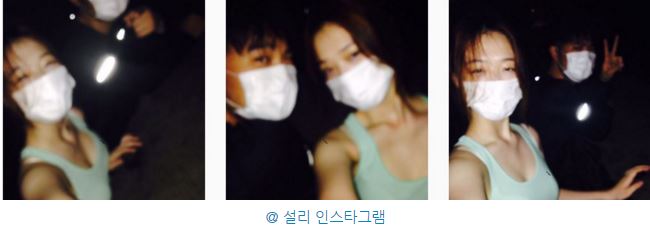 첫번째로 민트색 민소매 티셔츠를 입은 설리와 검정색 티셔츠를 입은 최자가 마스크를 쓴 채 즐거워하며 찍은 셀카 3장이 공개됐다.