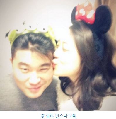 그 다음 사진에서 설리는 미니마우스 머리띠를 쓰고 최자의 얼굴에 뽀뽀를 하고 있다.