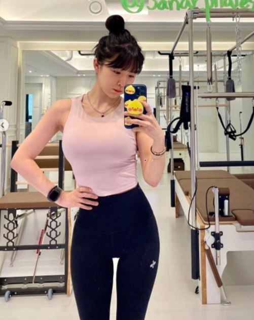 필라테스 교육 중인 조현영은 화장기 없는 민낯에도 청초미를 드러내며 팬들의 시선을 모으고 있다.