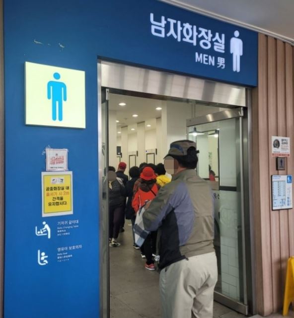 사진 속 남자 화장실에는 여성들이 줄을 서 있었고, 맨 앞에는 한 남성이 서 있었다. 또한 한 할머니가 남자 화장실에서 나오는 모습도 포착됐다.