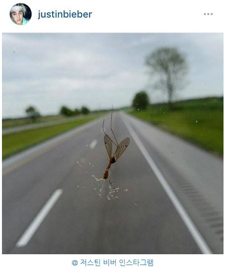 먼저 "Samsung photo"라며 자동차 앞 유리에 달라붙어있는 죽은 벌레 사진을 올렸다. 2차선 도로와 푸른 들판, 흐릿한 하늘이 배경으로 보인다.