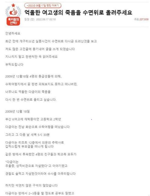 이를 본 누리꾼들은 "너무 마음 아프네요. 얼마나 힘들었을까요. 다시 검색해봐야겠어요", "가해자들은 지금까지 아무렇지 않게 산다는 게 너무 화나고 분하네요", "지금이라도 제대로 조사해주세요" 등의 댓글을 남기며 안타깝고 분한 마음을 표했다.