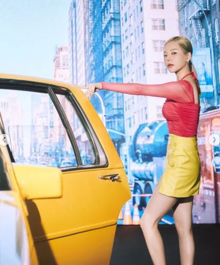 사진에서 써니는 강렬한 레드 컬러의 홀터넥이 돋보이는 상의를 완벽하게 소화하고 있는 모습이다. 그는 네크라인이 깊게 파인 상의로 섹시미를 더했다. 특히 노란색 가죽 치마도 완벽하게 소화하며 늘씬한 각선미도 자랑했다.