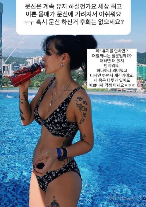 이어 한 누리꾼이 '예쁜 몸매가 문신에 가려져 아쉽다'는 반응을 보이자 "더하면 더했지 안지운다"며 "하나하나 의미있고 디자인해서 새겼고, 제 몸은 타투가 있어도 예쁘니까 걱정말라"고 답하기도 했다.