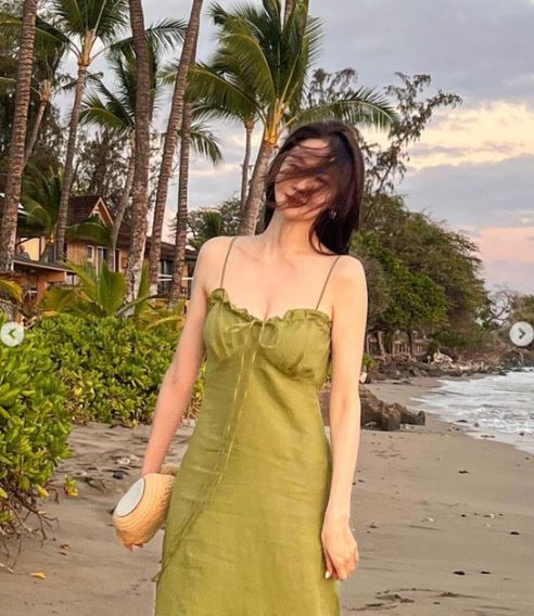 사진 속에는 하와이 해변을 배경으로 휴가를 즐기고 있는 강민경의 모습이 담겼다. 강민경은 노을이 지고 있는 해변가에서 초록색 원피스를 입고 산책을 즐기고 있다.