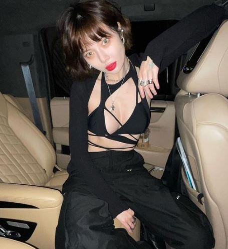 공개된 사진 속 현아는 올블랙 패션을 선보인 모습이다. 현아는 속옷 스타일의 절개가 있는 상의를 입고 검은색 바지를 입은 가운데, 과감한 노출과 함께 글래머 몸매가 돋보인다.