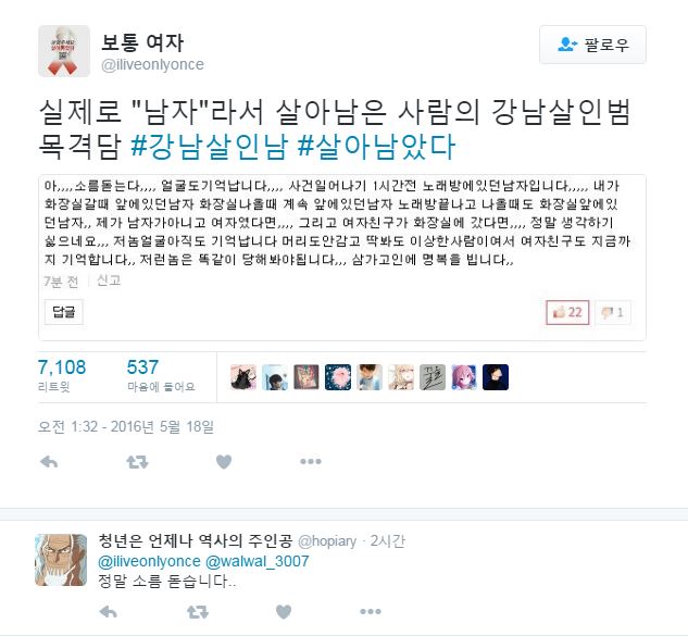 안타까운 사건이 발생했다. 대표적 '여성 혐오증'으로 보이는 30대 남성 살인마가 일면식도 없던 20대 여성을 흉기로 찔러 계획 살인했다. 상상하기 힘든 일이고 있어선 안될 일이었다. 자연스레 추모 분위기가 형성됐다. 현재 강남역 10번 출구에는 안타깝게 생을 마감한 이 여성을 추모하는 '포스트 잇' 물결이 일고 있다.