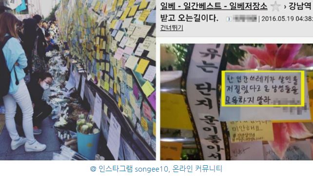 문제는 그 후에 더 커졌다. 사건 직후 SNS에는 이상한 메시지가 뜨기 시작했고 빠르게 전파됐다. 정리하면, 희생자를 기리기 위해 강남역 10번 출구를 찾은 여성들을 '몰카' 대상으로 삼은 남성이 았으며 또한 강남역 10번 출구에 붙은 일부 쪽지에는 "모든 남성을 모욕하지 마라'는 식의 메시지가 적혀있었다.