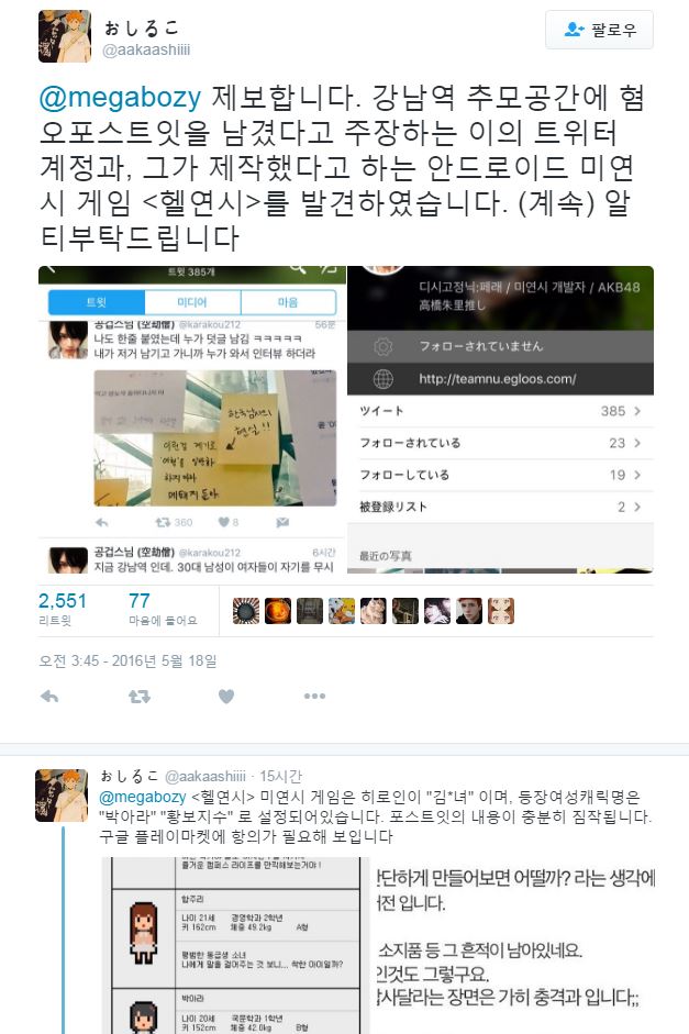 또한 현장에서 비슷한 주장을 하던 남성의 과거 행적을 확인해 보니 '미연시' 게임 등을 통해 대표적 '여성 혐오증'의 증거까지 나왔다며 SNS를 뜨겁게 달구고 있다. SNS, 온라인커뮤니티에서 발생한 강도 높은 다수의 여성과 소수의 남성 대립으로 인해, 현재 강남역 10번 출구 부근에는 경찰 병력이 배치됐다.