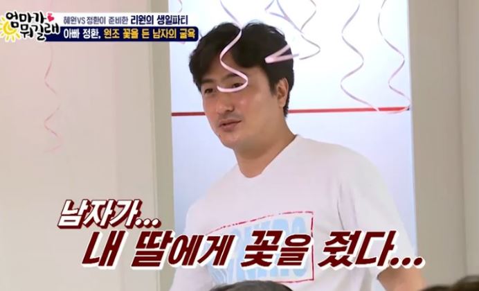 안정환은 "네가 준모니? 그래 늦게 잘 왔다"고 말했다. 엄마 이혜원은 리원 양에게 "얼굴 빨개졌네"라고 했고 안정환은 이어 "야, 학생들끼리도 너희들끼리도 꽃 주고받니? 부럽다"고 말했다. 안정환 표정이 더욱 씁쓸한 이유가 있었다. 안정환은 "아빠가 준비한 선물도 꽃다발이야. 그래서 네가(준모) 꽃 사와서 내가 속상한거야"라며 "내가 준비했는데 네가 먼저 주면 내가 뭐가 되니"라고 덧붙였다.