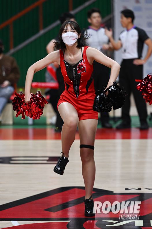 부산 사직실내체육관에서 ‘신한은행 SL 2022~2023 여자프로농구’ 부산 BNK썸과 청주 KB스타즈의 경기가 열렸다. BNK썸 김유나 치어리더가 응원을 하고 있다.