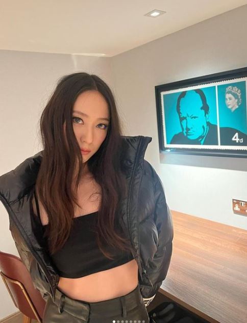 여기서 크리스탈은 크롭톱 위에 패딩, 가죽 바지를 매치한 시크한 패션으로 눈길을 끈다. 이국적인 미모와 늘씬한 몸매가 돋보인다.