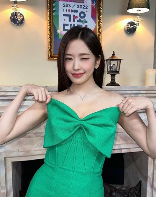 여기에는 안유진이 몸매가 드러나는 리본이 달린 초록색 원피스를 입고 포즈를 취하고 있다. 그녀는 아름다운 미모로 여신 포스를 풍겨 시선을 끌었다.