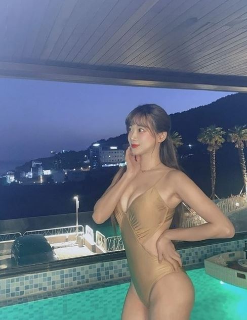 여기에는 김한나가 모노키니를 입고 포즈를 취하는 모습이 담겨있다. 베이지색 모노키니를 입은 김한나는 환상적인 S라인을 뽐내 시선을 사로잡는다.