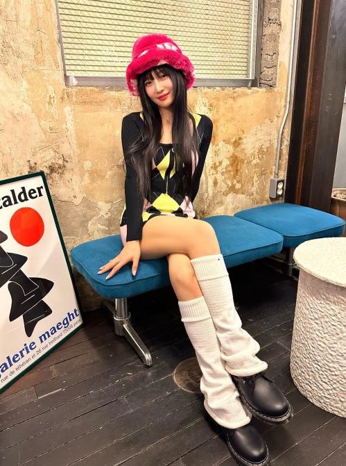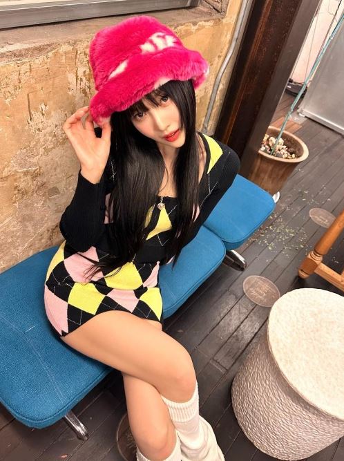 여기서 조이는 아가일 패턴 크롭 스웨터에 미니 스커트 셋업을 입고 있다. 또 최근 트렌드로 떠오른 퍼 버킷햇과 레그 워머를 매치해 상큼한 뉴트로 무드의 룩을 완성했다.