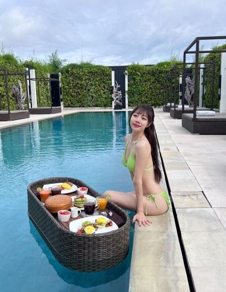 여기서 그녀는 리조트 수영장에서 연두색 비키니를 입은 채 여유를 즐기고 있다. 특히 은지는 완벽한 몸매와 볼륨감 있는 몸매로 시선을 사로잡았다.