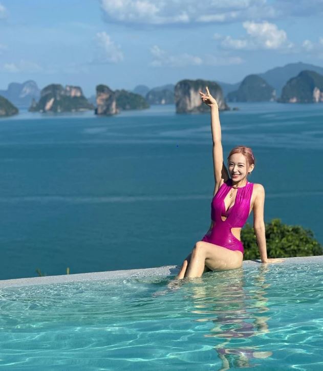 성소는 최근 인스타그램에 "TH"라는 글과 함께 사진 여러 장을 게재했다. 태국을 방문한 성소는 바다와 섬이 한눈에 보이는 수영장에서 과감한 포즈를 취하고 있다.