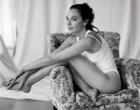 여기서 갤 가돗은 수영복을 연상케 하는 섹시한 의상을 입고 의자에 앉아 스트레칭을 하고 있는 모습이다.