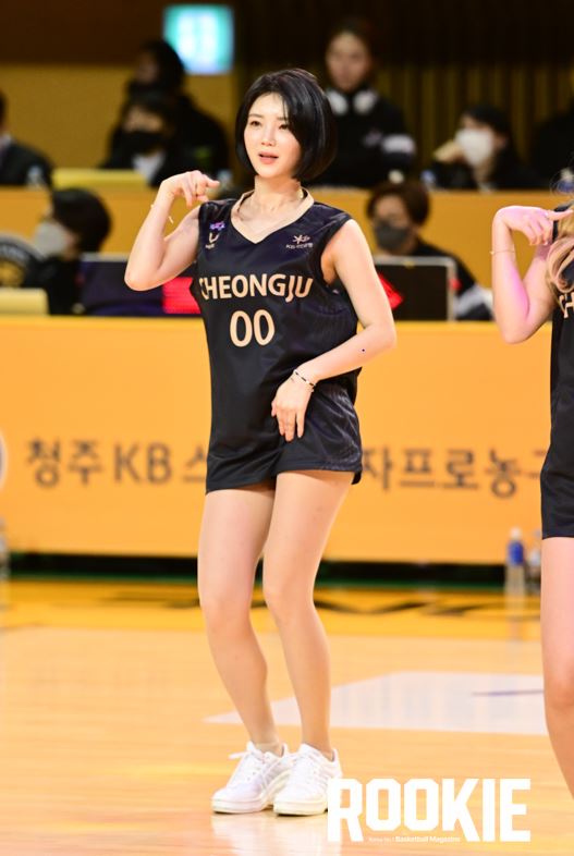 청주실내체육관에서 ‘신한은행 SOL 2022~2023 여자프로농구’ 청주 KB스타즈와 부산 BNK썸의 경기가 열렸다. 정유민 치어리더가 KB스타즈를 응원하고 있다.