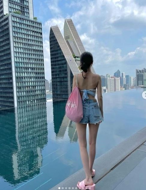 여기서 방민아는 탁 트인 방콕의 하늘과 도시 경관이 내려다 보이는 호텔 수영장에서 포즈를 취했다. 스카프를 묶어 튜브톱 스타일의 상의와 짧은 핫팬츠를 입은 차림이다. 마른 몸매가 드러나 눈길을 끈다.