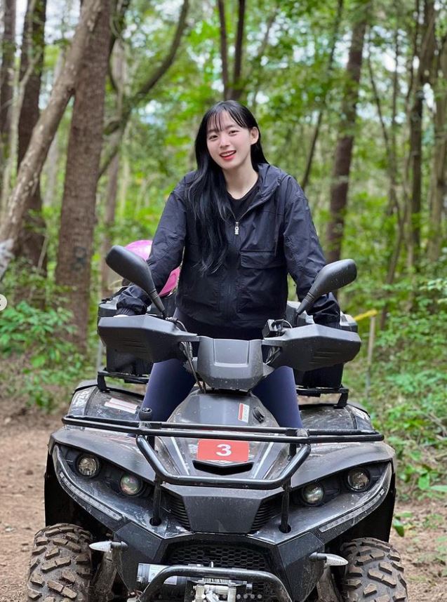 하지원 치어리더는 최근 인스타그램에 '나 운전에 소질 있는 듯'이라는 글과 함께 몇장의 사진을 공개했다. 사진 속 하지원 치어리더는 제주도로 추정되는 숲 속에서 4륜 규동 바이크에 몸을 싣고 있는 모습을 연출했다.