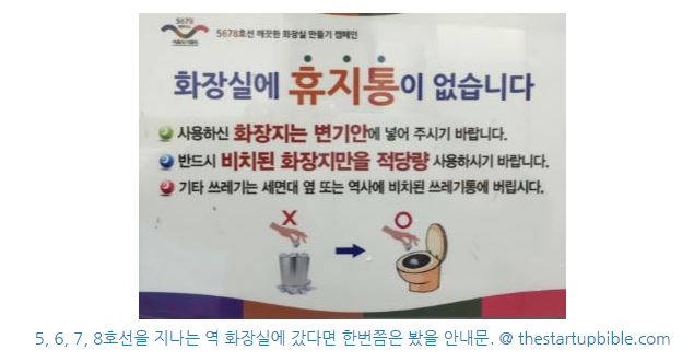 일본을 포함한 대부분의 나라에서는 다 쓴 휴지를 변기에 흘려보내는 것과 달리 한국은 쓰레기통에 휴지를 모아 버리고 있기 때문이다.