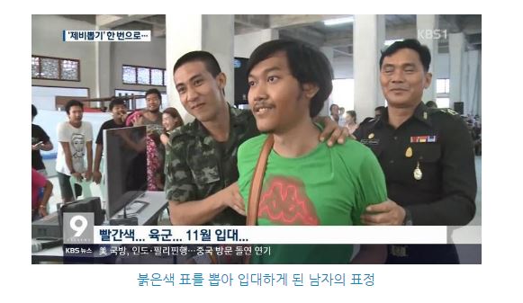 제비뽑기장에 모인 태국의 청년들은 앞사람이 제비 뽑는 것을 지켜보면서 '붉은색 표'가 나올 때마다 '환호성'을 내지른다. 앞사람이 붉은색 표를 많이 뽑을 수록 자신이 군대에 갈 확률이 줄어들기 때문.