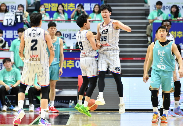 전반까지만 해도 경기는 시소 게임 양상으로 흘러갔다. 6강, 4강 플레이오프에서 히트 상품이 됐던 문성곤-문정현으로 이어지는 KT 포워드 라인이 최준용-송교창-이승현으로 구성된 KCC 포워드 라인과 백중세를 이뤘다. 여기에 패리스 배스가 득점을 쏟아내며 두 팀은 팽팽한 줄다리기를 이어갔다.