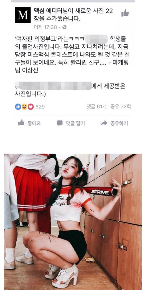 13일 남성잡지 맥심은 페이스북 페이지 '맥심 에디터'에 모 여고 재학생에게 받은 사진이라며 여고생들이 졸업사진을 찍기 위해 다양한 분장을 하고 있는 사진을 개제했다.