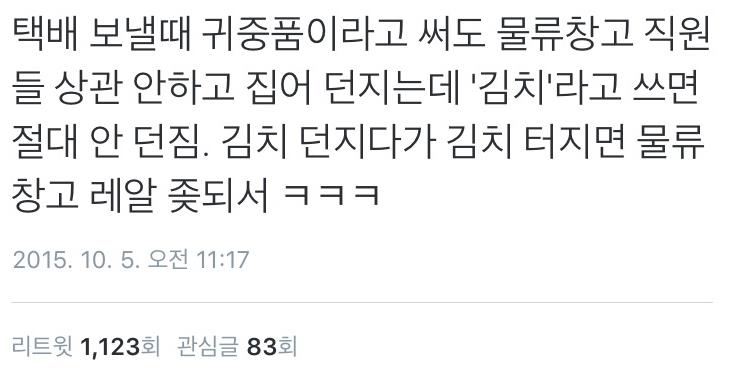 깨지거나 파손의 우려가 있는 상품은 이제 '김치'라고 적어 택배를 보내도록 하자.