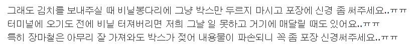 트위터리안의 이 '팁'은 실제로도 효력이 있을 것으로 추측된다. 택배 물류창고 아르바이트를 하고 있는 한 누리꾼의 후기에 따르면 김치 상자의 비닐이 터져 버리면 하루종일 거기에만 매달리게 된다고 한다.