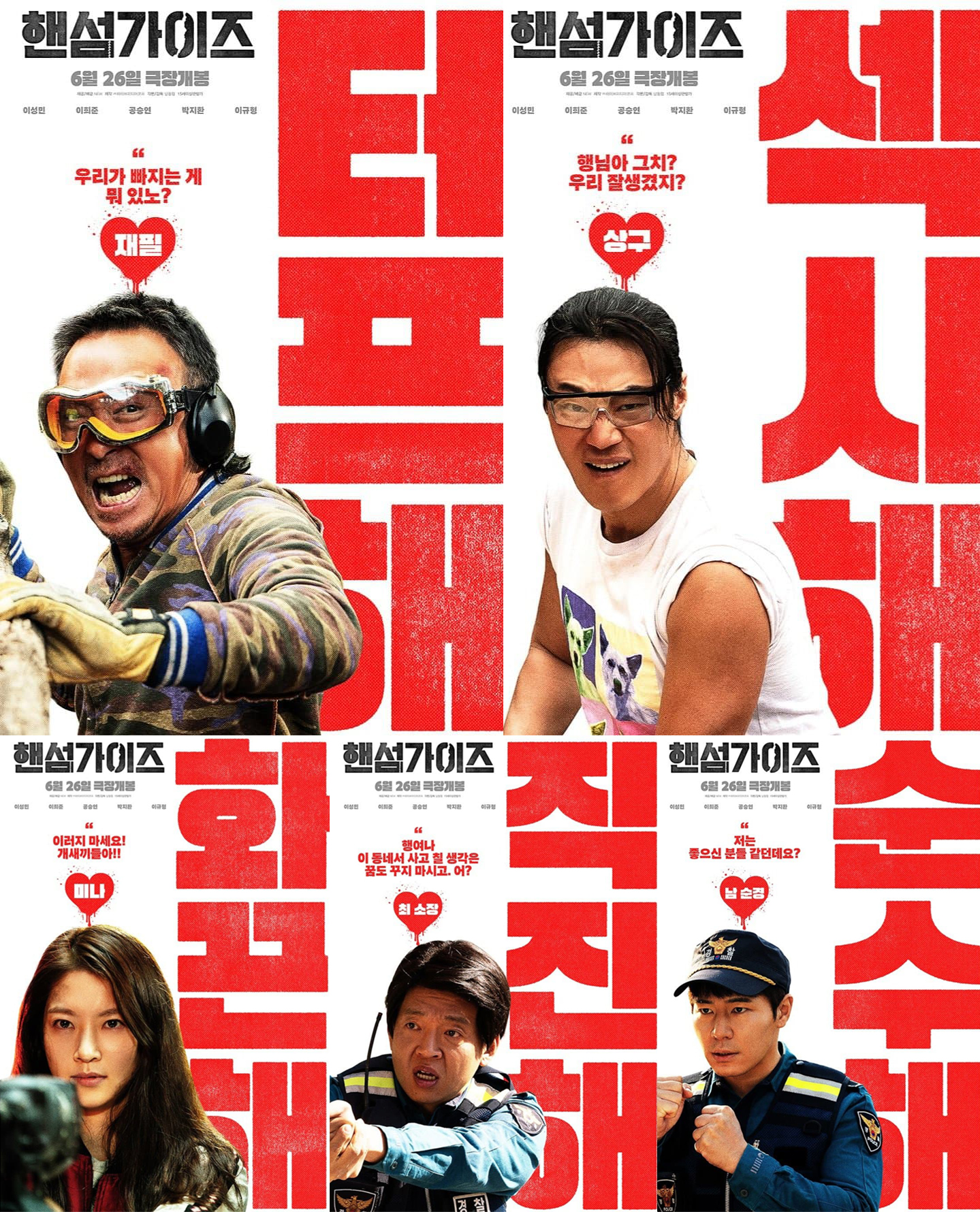 배급사 NEW는 이성민과 이희준이 주연을 맡은 영화 ‘핸섬가이즈’의 5인 1견 캐릭터 포스터 6종을 공개했다. ‘핸섬가이즈’는 절대 잊을 수 없는 인물 재필(이성민)과 상구(이희준)가 전원생활을 꿈꾸며 새집으로 이사 온 날, 지하실에 봉인됐던 악령이 깨어나며 벌어지는 고자극 오싹 코미디를 그린 작품이다.