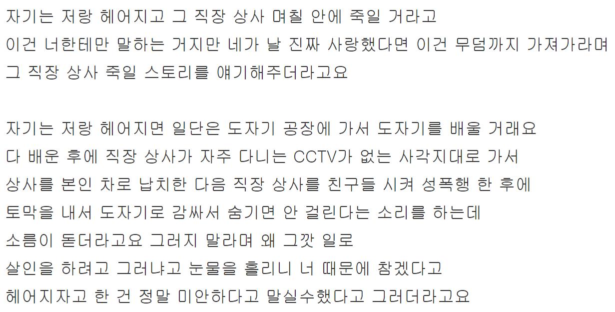 "자기(남자친구)는 저(글쓴이)랑 헤어지면 일단은 도자기 공장에 가서 도자기를 배울 거래요. 다 배운 후에 직장 상사가 자주 다니는 CCTV가 없는 사각지대로 가서 상사를 본인 차로 납치한 다음 토막을 내서 도자기로 감싸서 숨기면 안 걸린다는 소리를 하는데"
